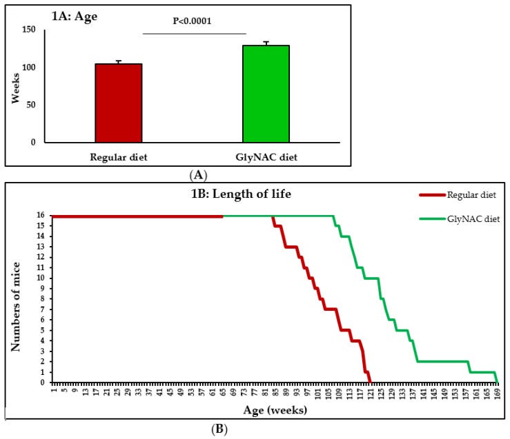 Ve studii GlyNAC (Glycine and N-Acetylcysteine) Supplementation in Mice Increases Length of Life by Correcting Glutathione Deficiency, Oxidative Stress, Mitochondrial Dysfunction, Abnormalities in Mitophagy and Nutrient Sensing, and Genomic Damage provedené na myších vykázala kombinace glycinu a NAC (N-Acetylcysteinu) vynikající výsledky. Jak vidíte z níže uvedeného grafu, ve srovnání s kontrolní skupinou, která konzumovala běžnou stravu ad libitum, žily myši na GlyNAC o 23,7% déle (104,0 ± 3,0 vs. 128,6 ± 4,2 týdne) a to bez ohledu na pohlaví.
